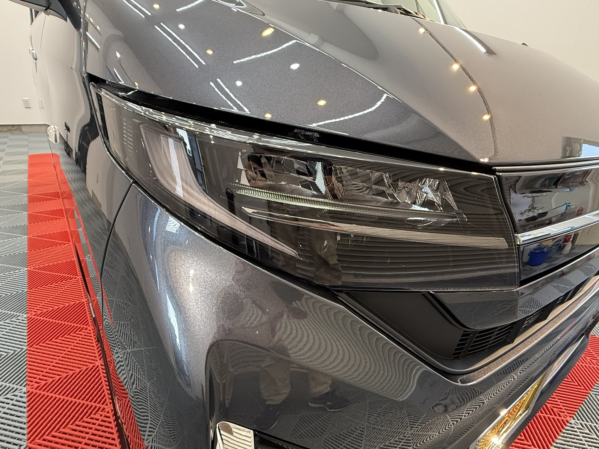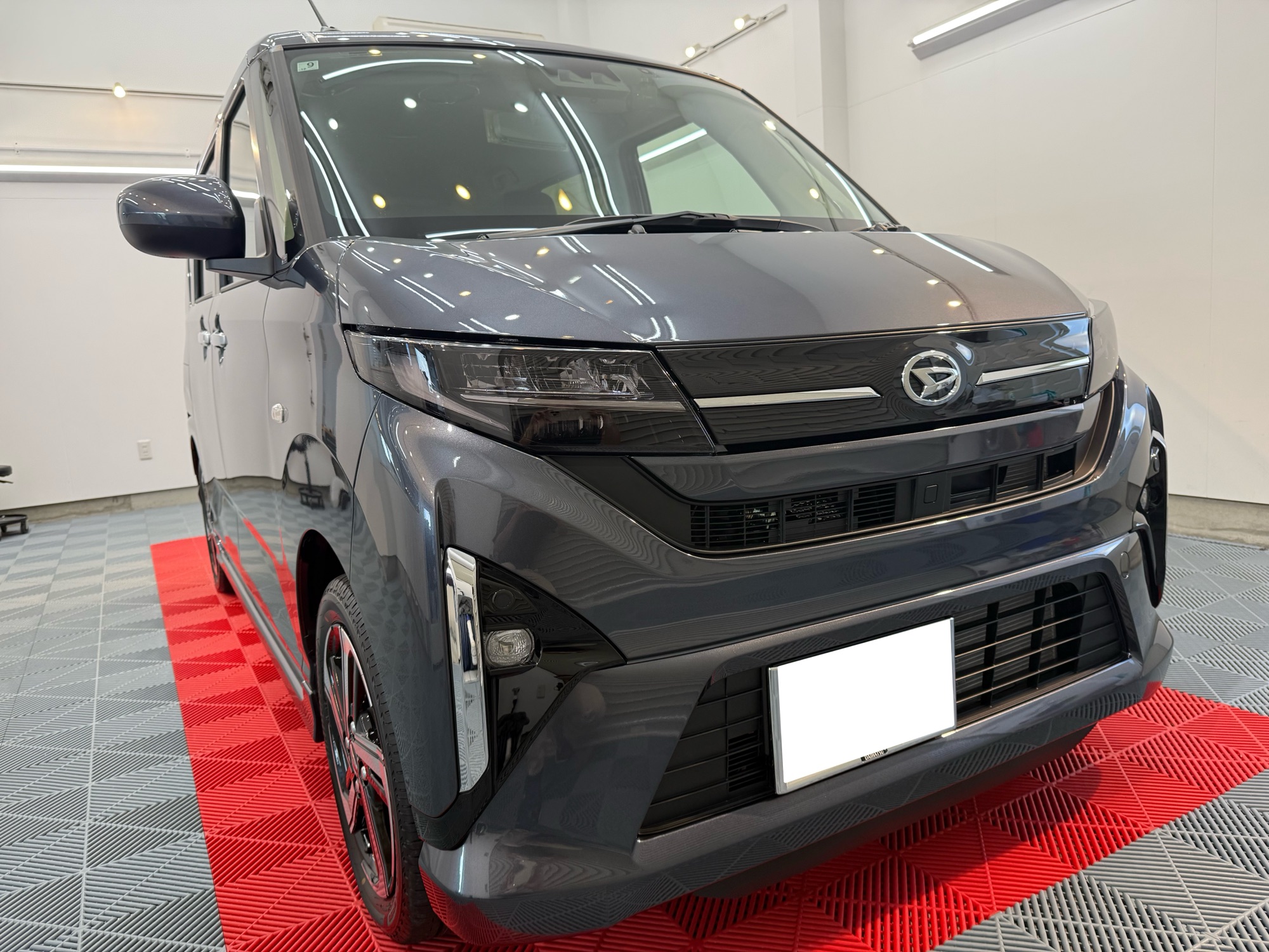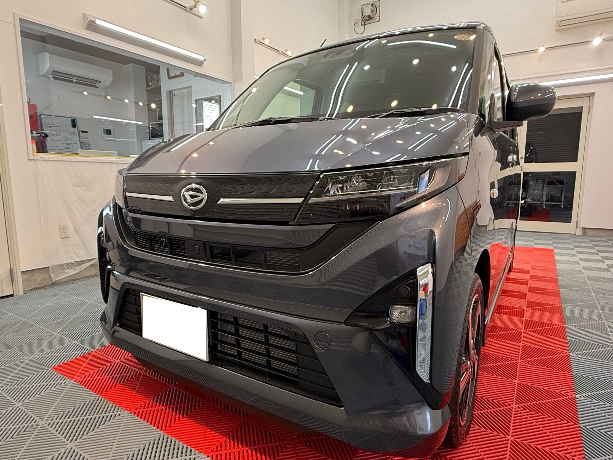 施工打ち合わせの時、ヘッドライト保護の提案をさせていただきました。しかも、この新型ムーブのルックスにはライトスモークが合うと思い、オススメさせていただきました。