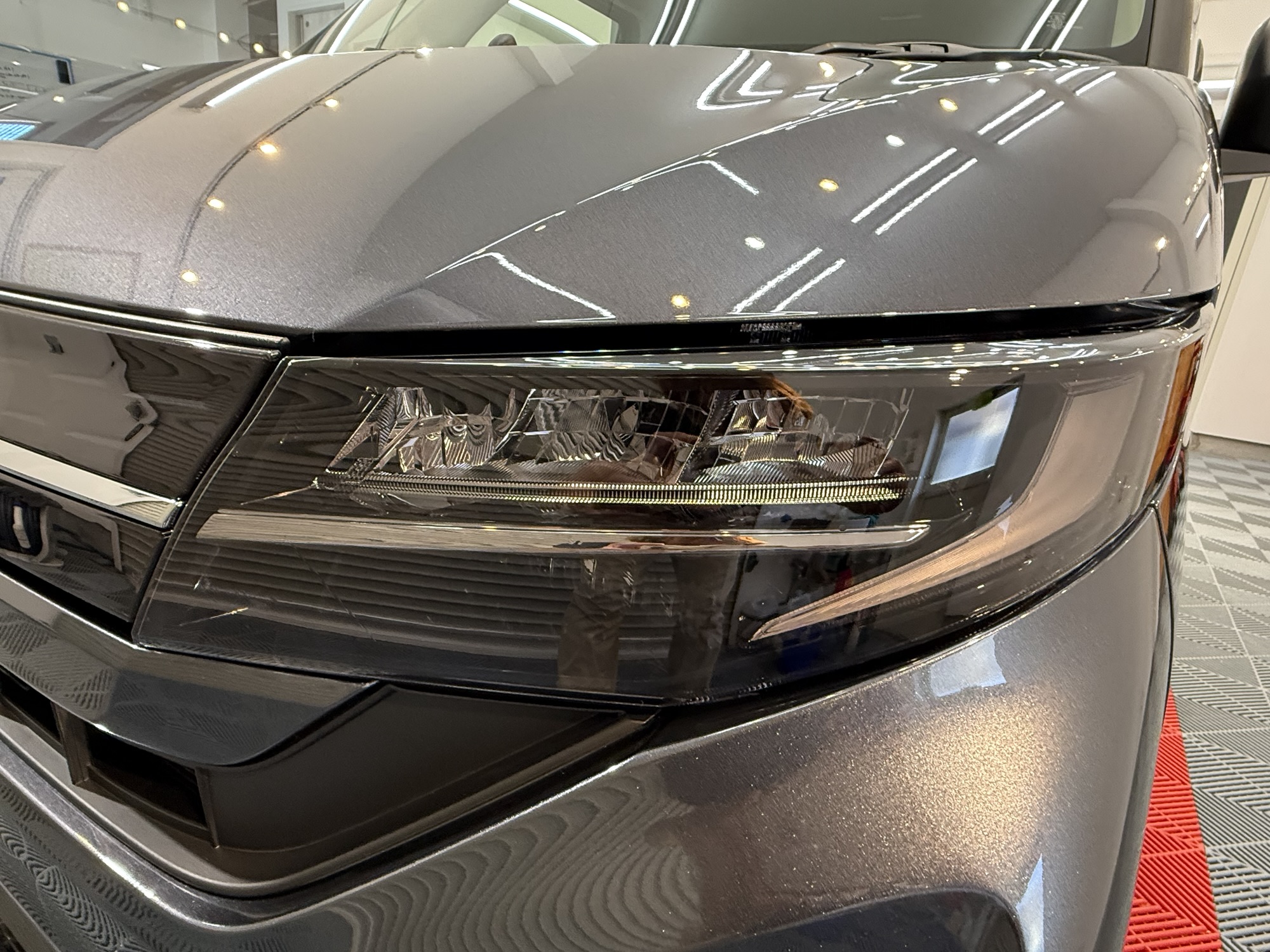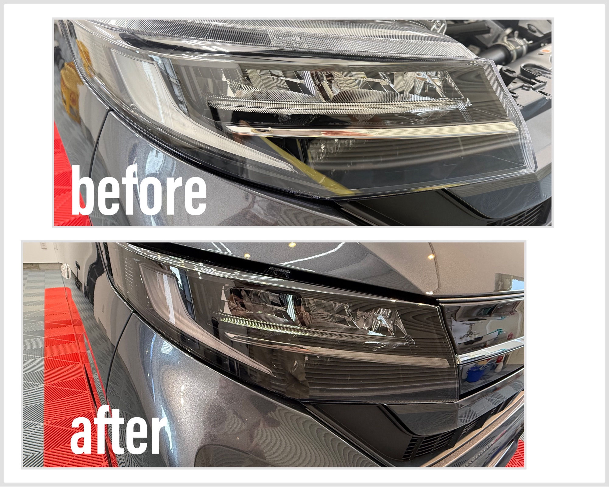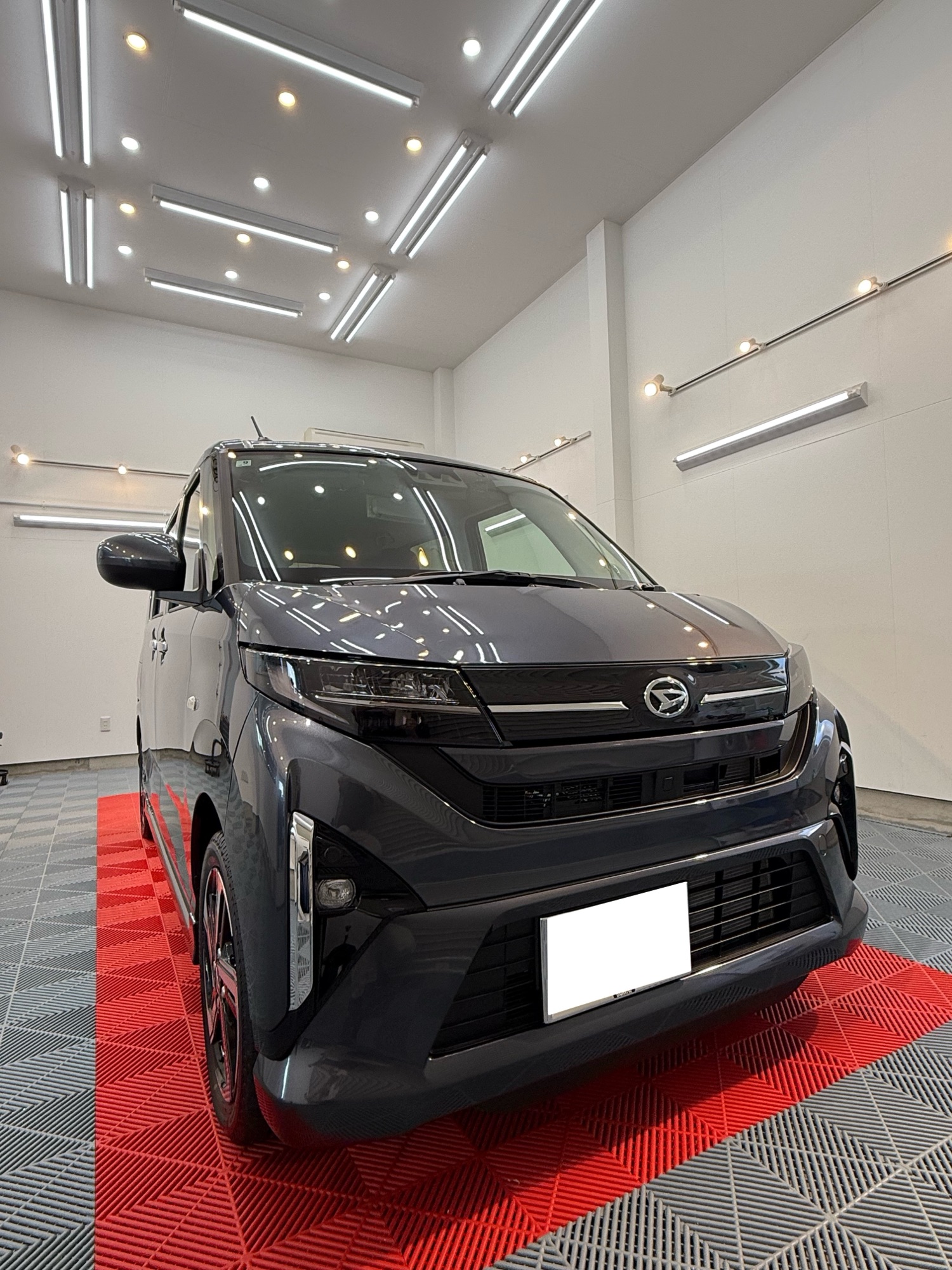 施工打ち合わせの時、ヘッドライト保護の提案をさせていただきました。しかも、この新型ムーブのルックスにはライトスモークが合うと思い、オススメさせていただきました。